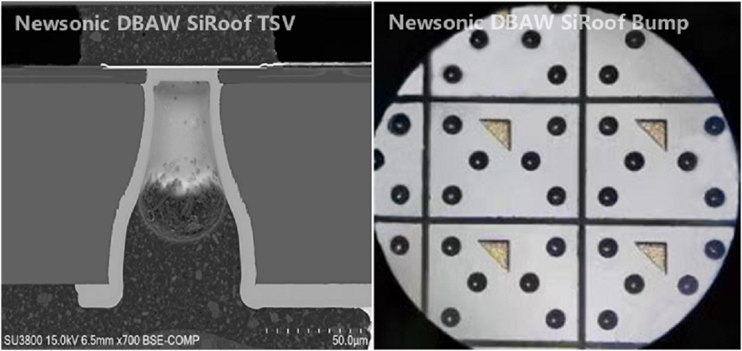 Newsonic launched its original D-BAW product series with the SiRoof packaging solution in 2021. The product features a raw silicon cap (Raw Si Cap) combined with organic dry film bonding (Organic Bonding), and Newsonic has laid out core technology patents in the United States and China, US20220103147A1 and CN113556098B, respectively. In the SiRoof design, the layout of TSVs differs from conventional WLP practices by placing the electrically interconnected TSVs on one side of the device, not on the cap side, This design means that the current path does not need to cross the bonding interface, effectively avoiding potential reliability issues caused by residual stresses in the bonding interface, the reliability level is consistent with Avago's, significantly enhancing the product's stability and durability. Compared to the Microcap, which involves multiple photomasks and complex processing steps, Newsonic's SiRoof wafer requires only one photomask, akin to a roof (Roof) covering the walls formed by the organic bonding layer, overall shortening the manufacturing cycle and reducing costs.