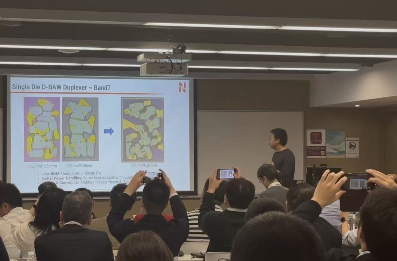 At the Acoustic Wave Resonator (AWR) Industry Forum, Dr. Feng delivered a presentation titled *“RF Filters for 5G/6G Applications Based on Double-Sided Process Technology.” In his talk, he introduced NEWSONIC’s proprietary D-BAW® double-sided process technology. By systematically reconstructing the underlying manufacturing architecture of BAW filters, the technology effectively addresses performance degradation issues associated with high-frequency and wide-bandwidth applications, significantly improving device quality factor (Q) and thermal stability.